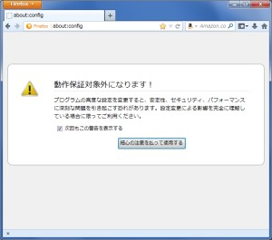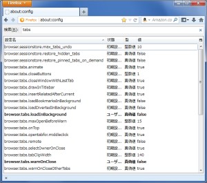 ロケーションバーに「about:config」と入力しEnterを押下することで、ユーザー設定を編集するためのGUIが表示されます。そこで設定を変更すると、即座にprefs.jsファイルに書き込まれます。